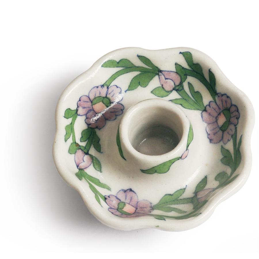 Pink Flowers With Green Leaves On White Base Candle Stand