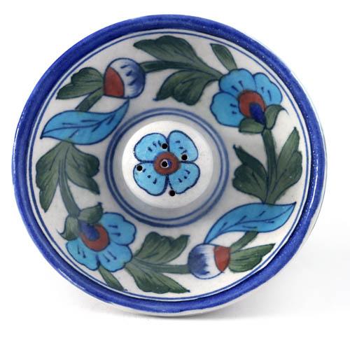 Blue Pottery Agarbatti Plate :Turquoise and red flower with green leaf design on White base incense holder from Jaipur, India. Unique, hand painted agarbatti stand for worship place.