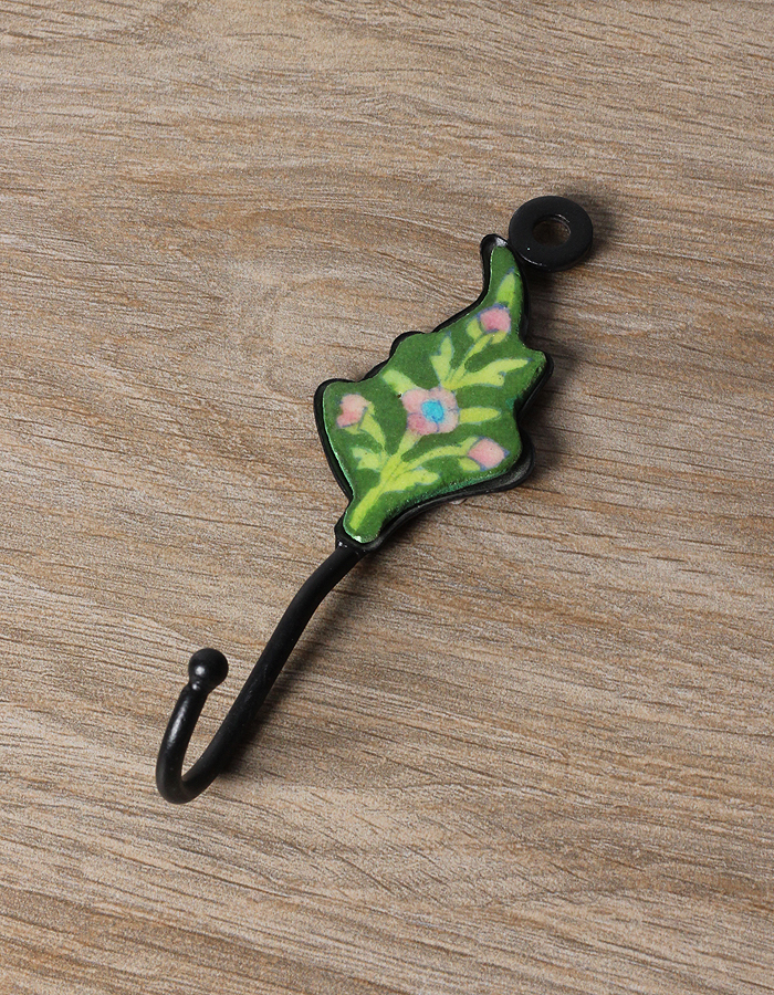 JAIPUR BLUE POTTERY HANDMADE LEAF HOOK WITH IRON -GREEN WITH PINK FLOWER