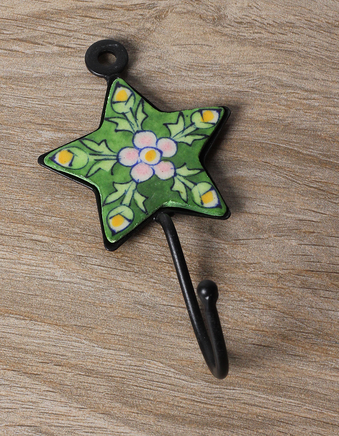 JAIPUR BLUE POTTERY HANDMADE STAR HOOK SMALL WITH IRON - GREEN BASE /PINK FLOWER