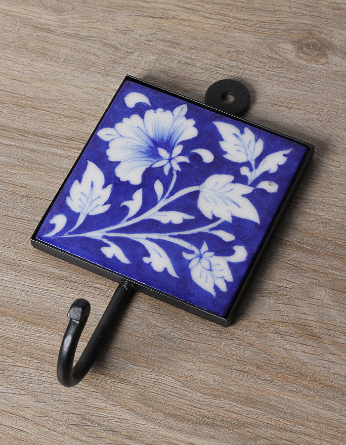 JAIPUR BLUE POTTERY HANDMADE TILE HOOK  WITH IRON 4X4 INCHES- BLUE BASE WITH WHITE FLOWER