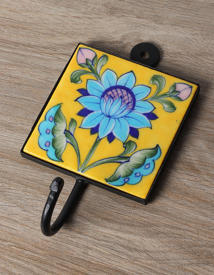 JAIPUR BLUE POTTERY HANDMADE TILE HOOK WITH IRON 4X4 INCHES- YELLOW BASE WITH TURQUOISE FLOWER