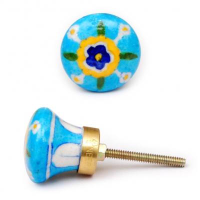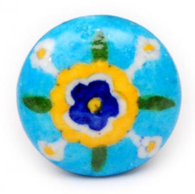 Turquoise Knob with White, Yellow, Blue and Green Flowers