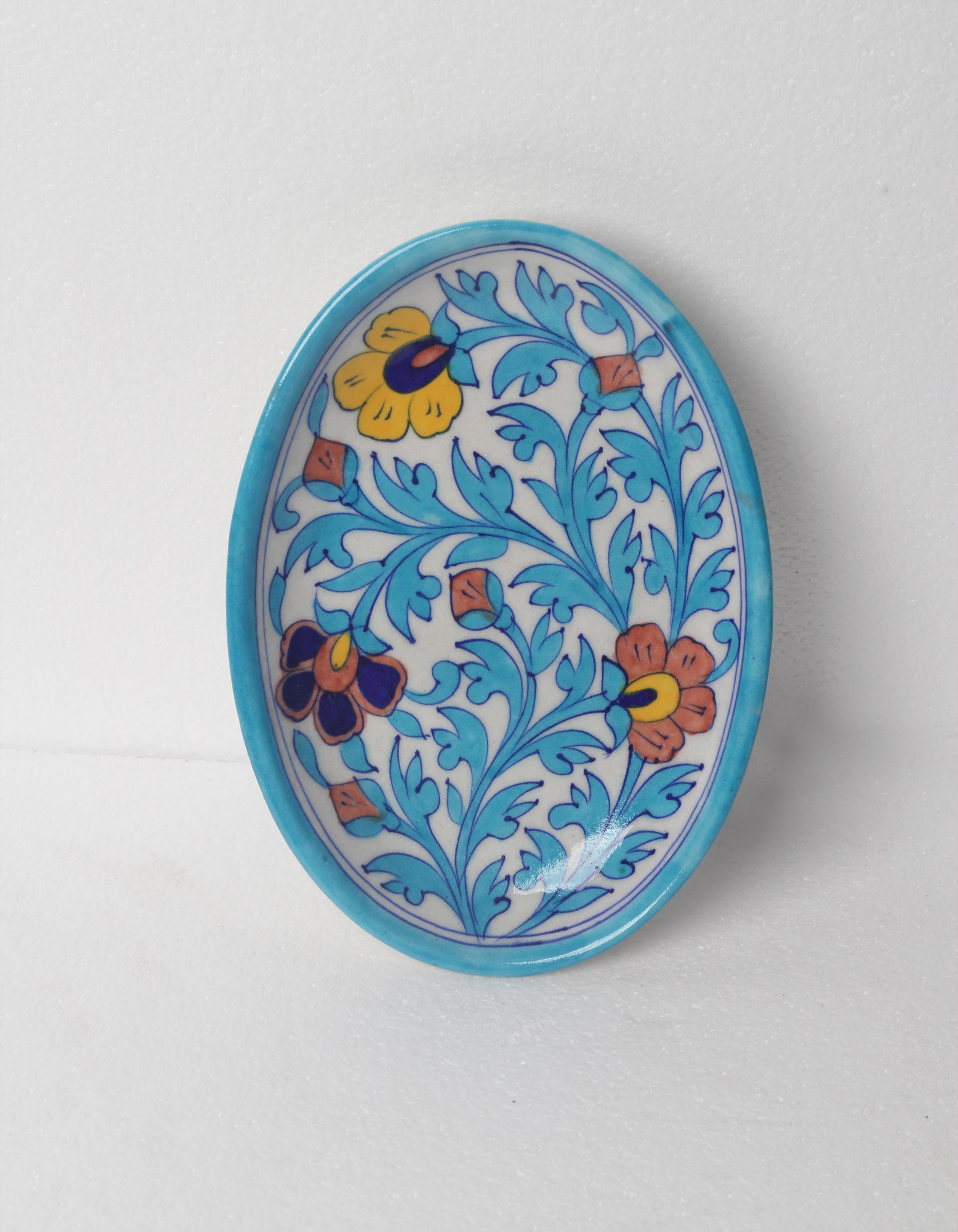 A Decorative Blue Pottery Oval Plate by NEERJA Blue Pottery used for Wall and Table Decoration is hand-painted and manufactured by skilled artisans from years. This beautiful wall decor plate will enhance & give a very rich traditional look to your home.
