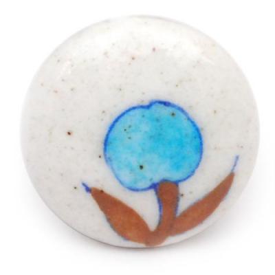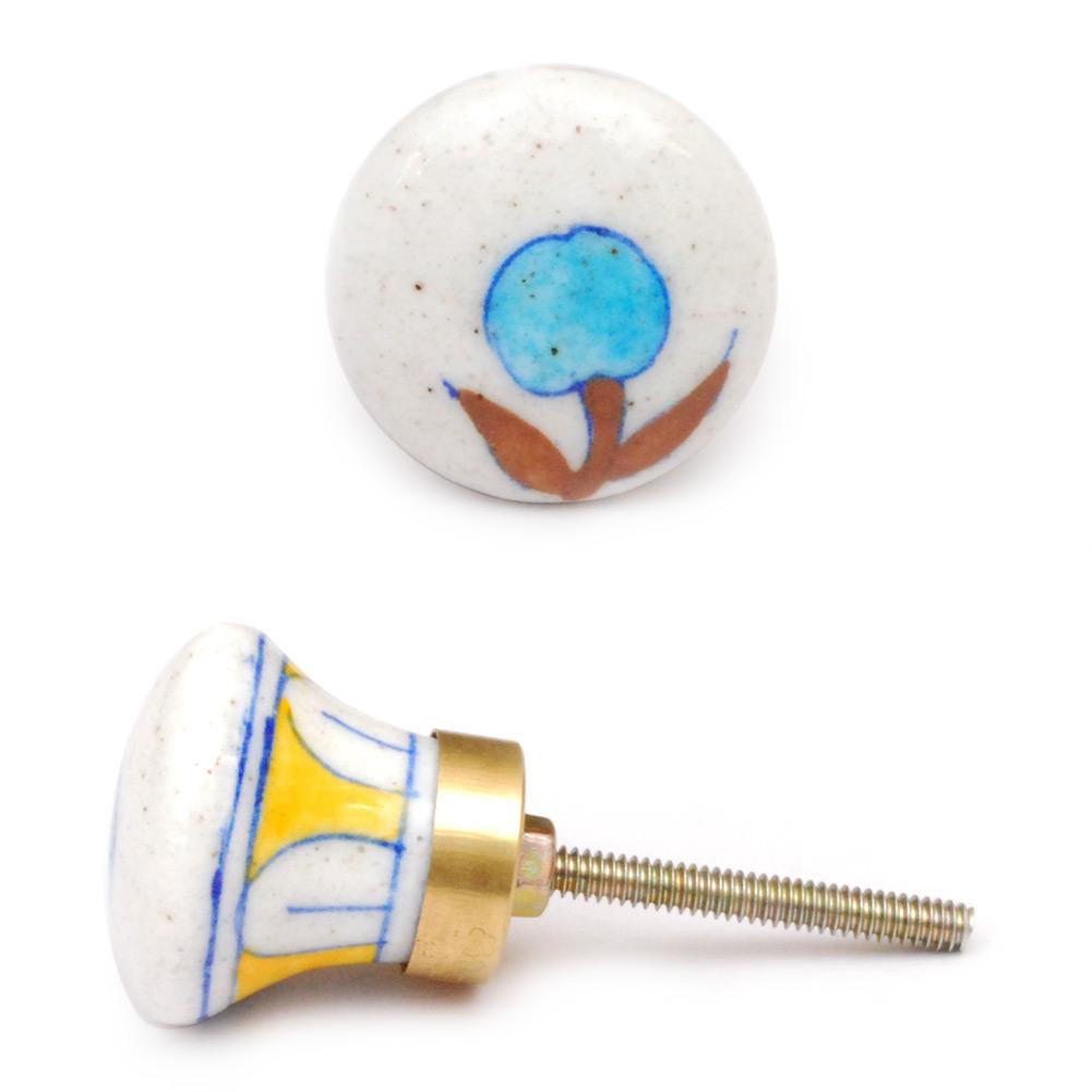 White and Yellow Ceramic Knob with Turquoise Flower and Green Leaves