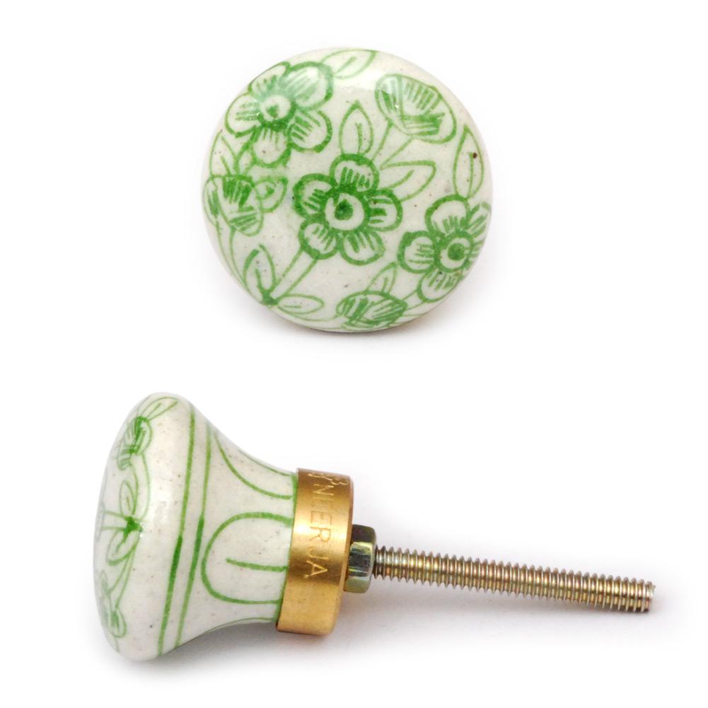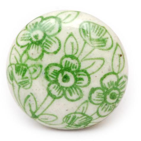 White Ceramic Cabinet Knob with Green Flowers