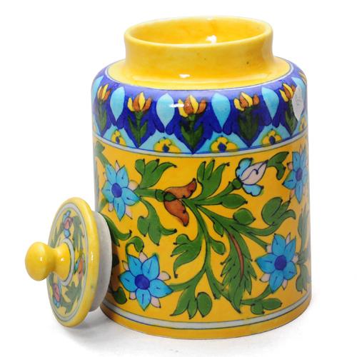 Jaipur Blue Pottery Handmade Jar 6" with lid - yellow base with blue flower
